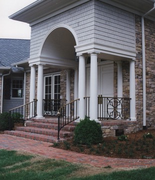 Residential Entry with Curved Bronze Cap and Balcony Accent